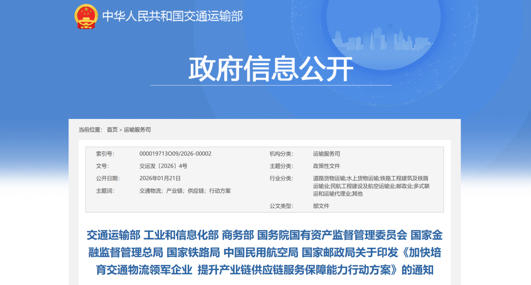 为贯彻落实党中央、国务院关于有效降低全社会物流成本的决策部署,培育壮大具有国际竞争力的交通物流企业,提升产业链供应链服务保障能力,更好服务支撑现代化产业体系建设,现将《加快培育交通物流领军企业 提升产业链供应链服务保障能力行动方案》印发给你们,请结合实际,认真抓好落实。